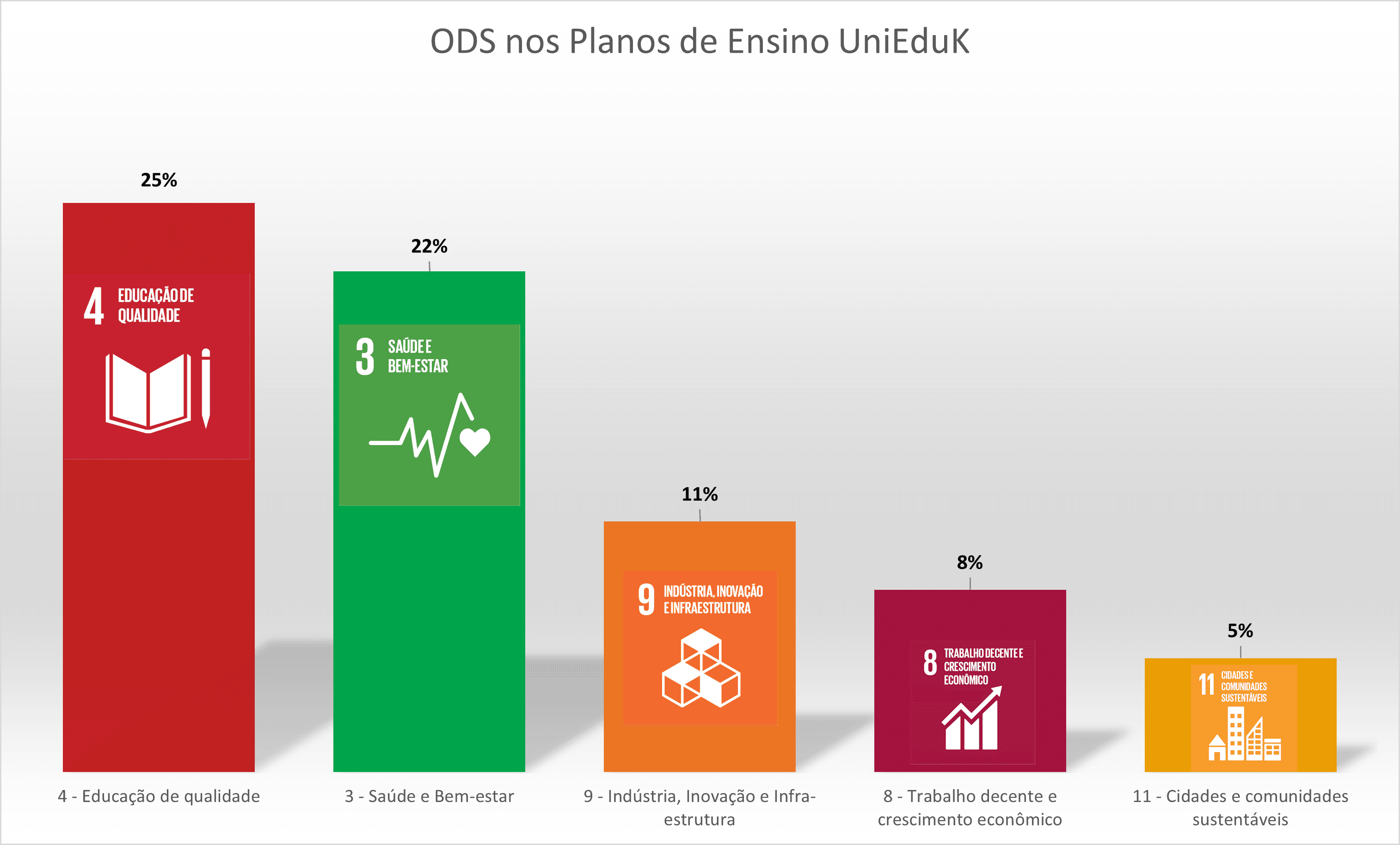 Os cinco ODS mais selecionados correspondem a 70% das escolhas nos planos de ensino, sendo o ODS 4 - Educação de Qualidade responsável por 25% das seleções. Os outros ODS são, respectivamente, ODS 3 - Saúde e Bem-estar (22%), ODS 9 - Indústria, Inovação e Infraestrutura (11%), ODS 8 - Trabalho decente e crescimento econômico (8%) e ODS 11 - Cidades e comunidades sustentáveis (5%).