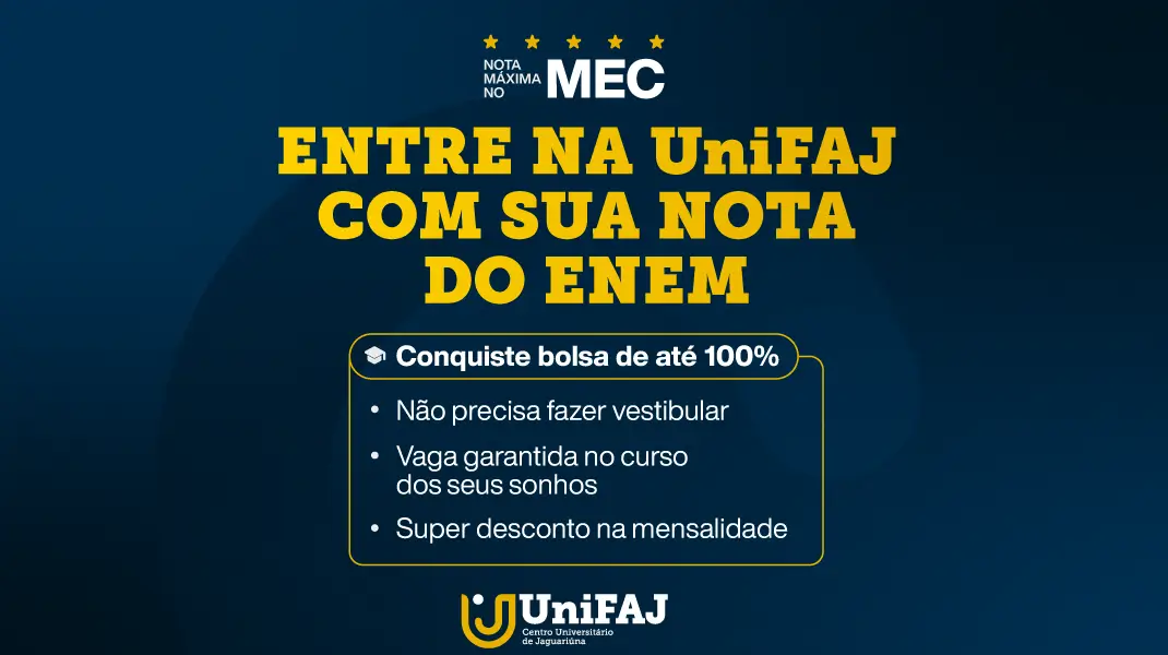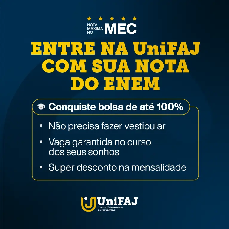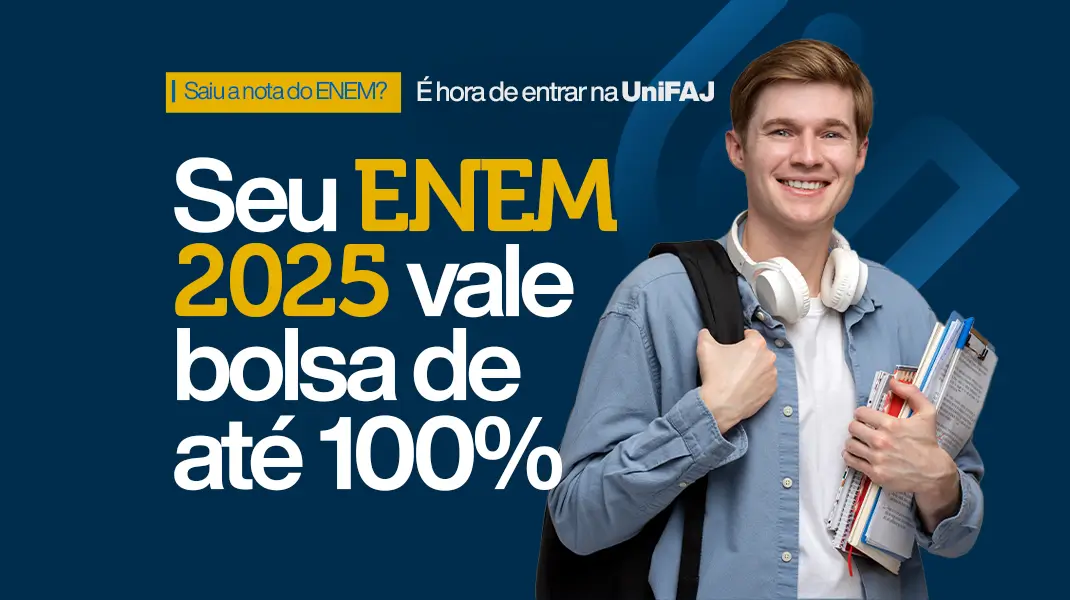 Na UniFAJ, a sua nota do ENEM vale bolsa de estudos para o curso dos seus sonhos. Basta inserir a sua pontuação no formulário e descobrir o desconto que você pode conquistar.