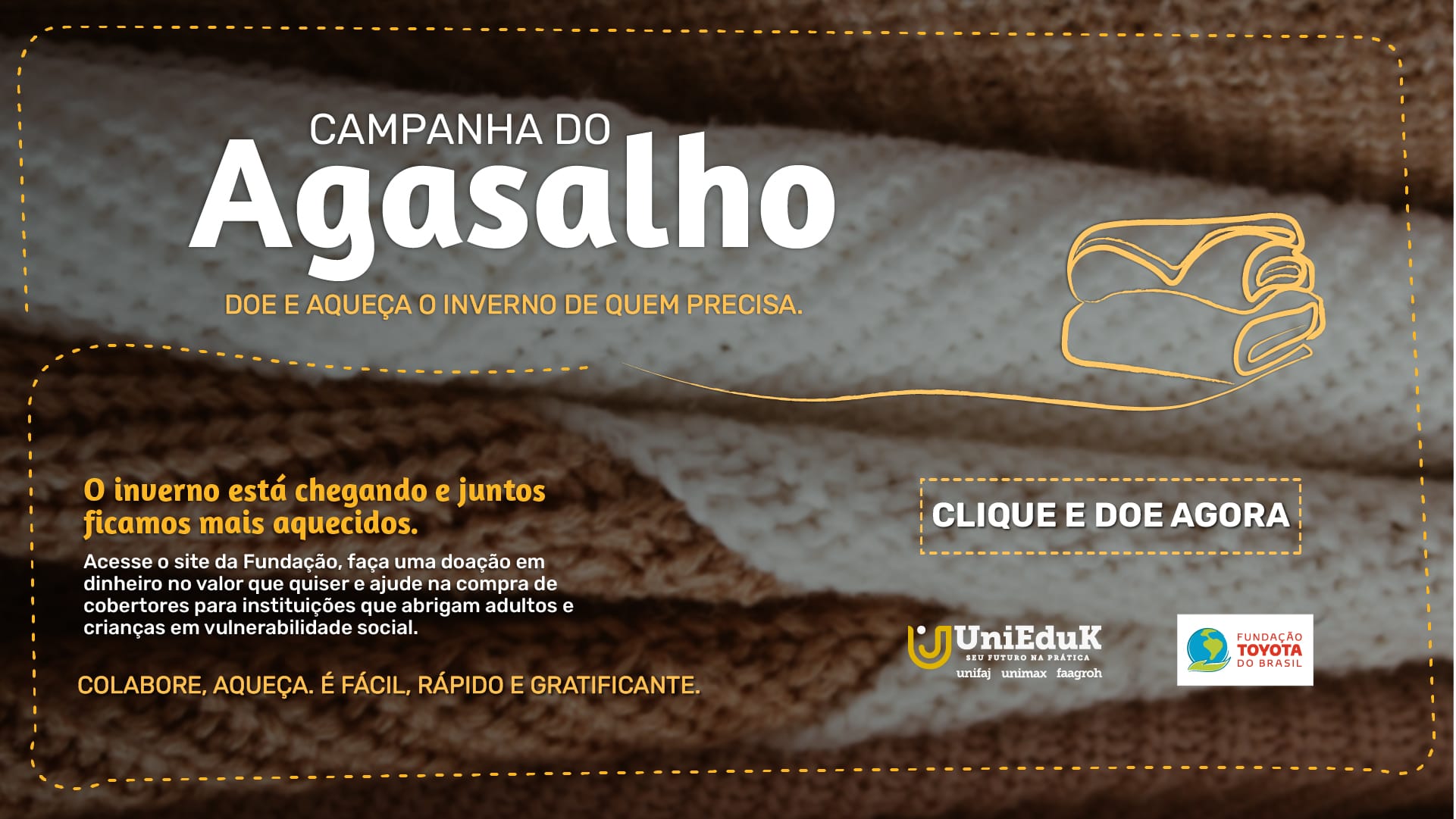 Ao completar 22 anos, o Grupo UniEduK (composto pela UniFAJ, UniMAX e Faagroh) faz questão de reforçar seu compromisso em desenvolver e fomentar projetos de responsabilidade socioambiental. É o caso do apoio à Campanha do Agasalho 2021 da Fundação Toyota do Brasil, que acontece até o dia 11 de julho.