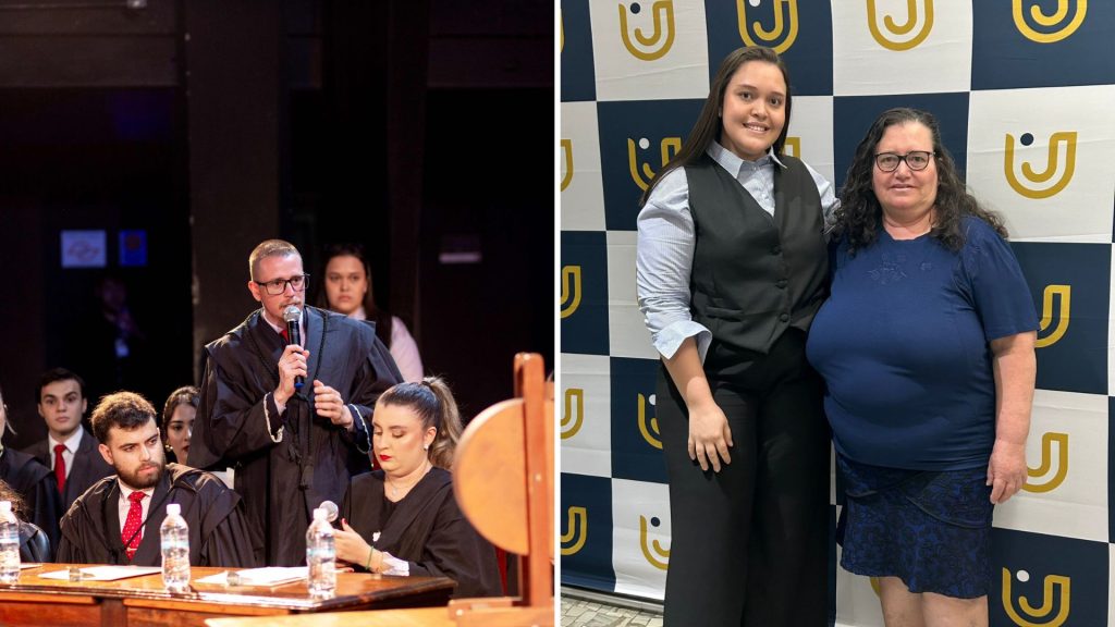 Ana Laura destacou ainda a emoção de acompanhar o crescimento dos colegas durante a preparação e a simulação. “Ver cada aluno ganhar confiança e superar medos me encheu de orgulho. Senti que crescia junto com eles”. A estudante também comentou a importância pessoal desse momento, reforçada pela presença de sua mãe na plateia. “Saio dessa experiência com o coração transbordando gratidão e amor pelo Direito.”