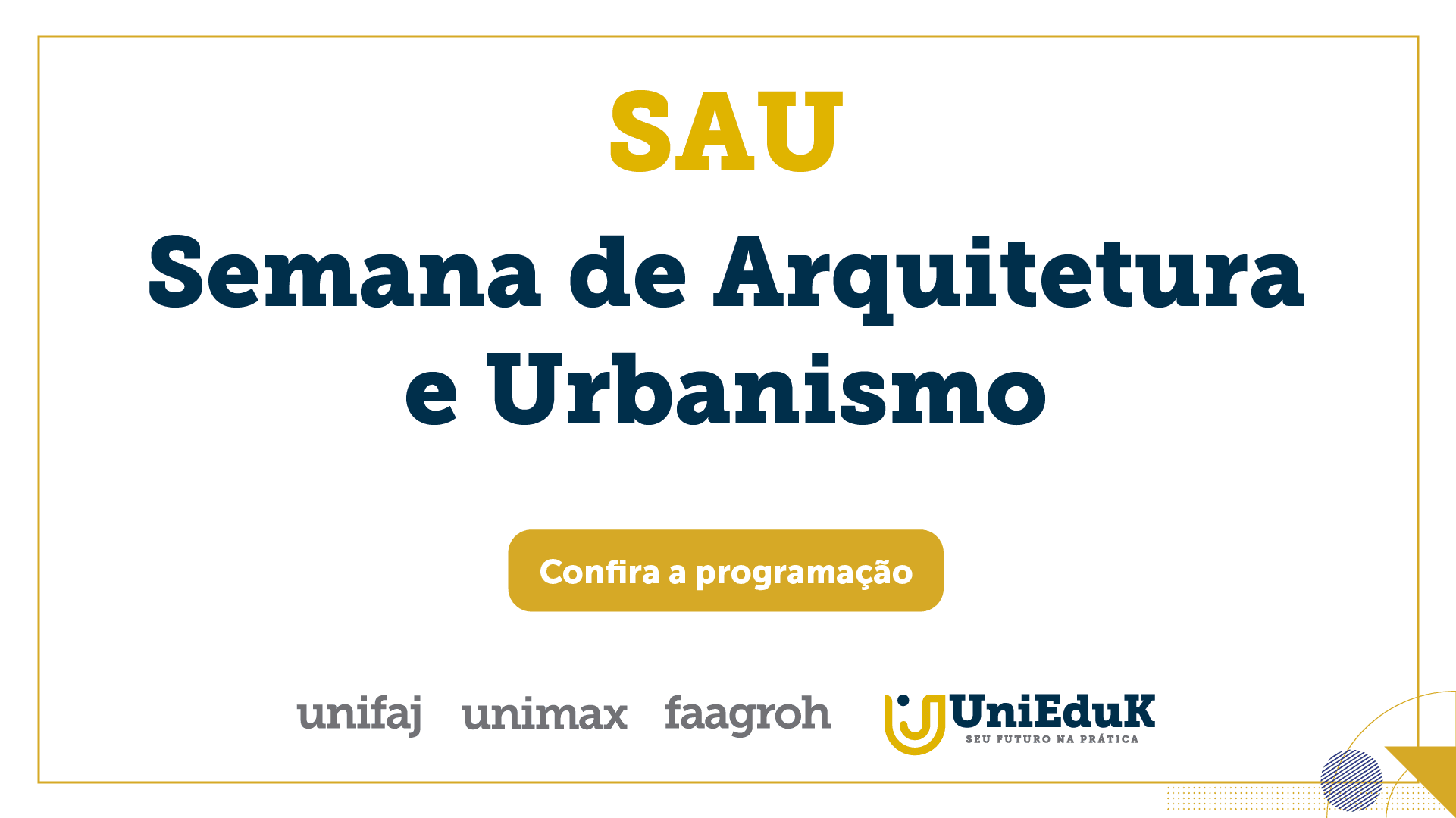 O Grupo UniEduK realiza, nos dias 13, 14 e 15/10, a SAU - Semana de Arquitetura e Urbanismo, com palestras e oficinas que acontecerão em ambas as unidades (UniMAX e UniFAJ).